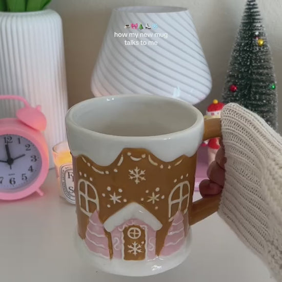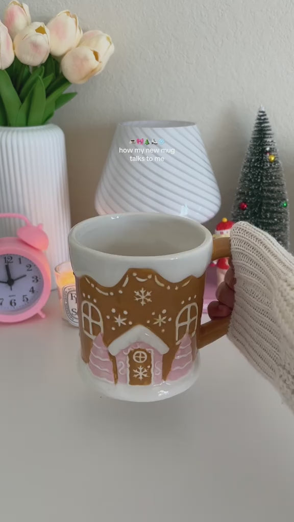 Celebrate the holiday season with this charming gingerbread house mug! Crafted from high-quality ceramic, this festive cup features a 3D gingerbread design with snowy roof details, pink trees, and delicate white accents — just like a cozy winter cottage.